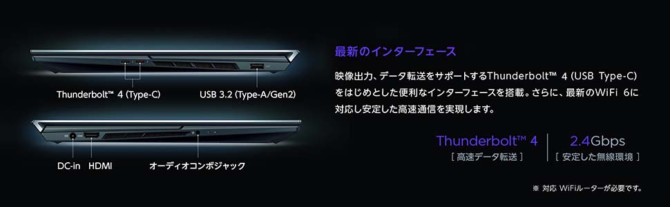 【USBポート】Thunderbolt 4 (Type-C)※ データ転送と映像出力をサポートしています。すべてのデバイスの動作を保証するものではありません。本機への給電はサポートしていません。)×2、USB3.2 (Type-A/Gen2)×1【オーディオ】ステレオスピーカー内蔵 (1W×2)、アレイマイク内蔵、マイクロホン/ヘッドホン・コンボジャック×1